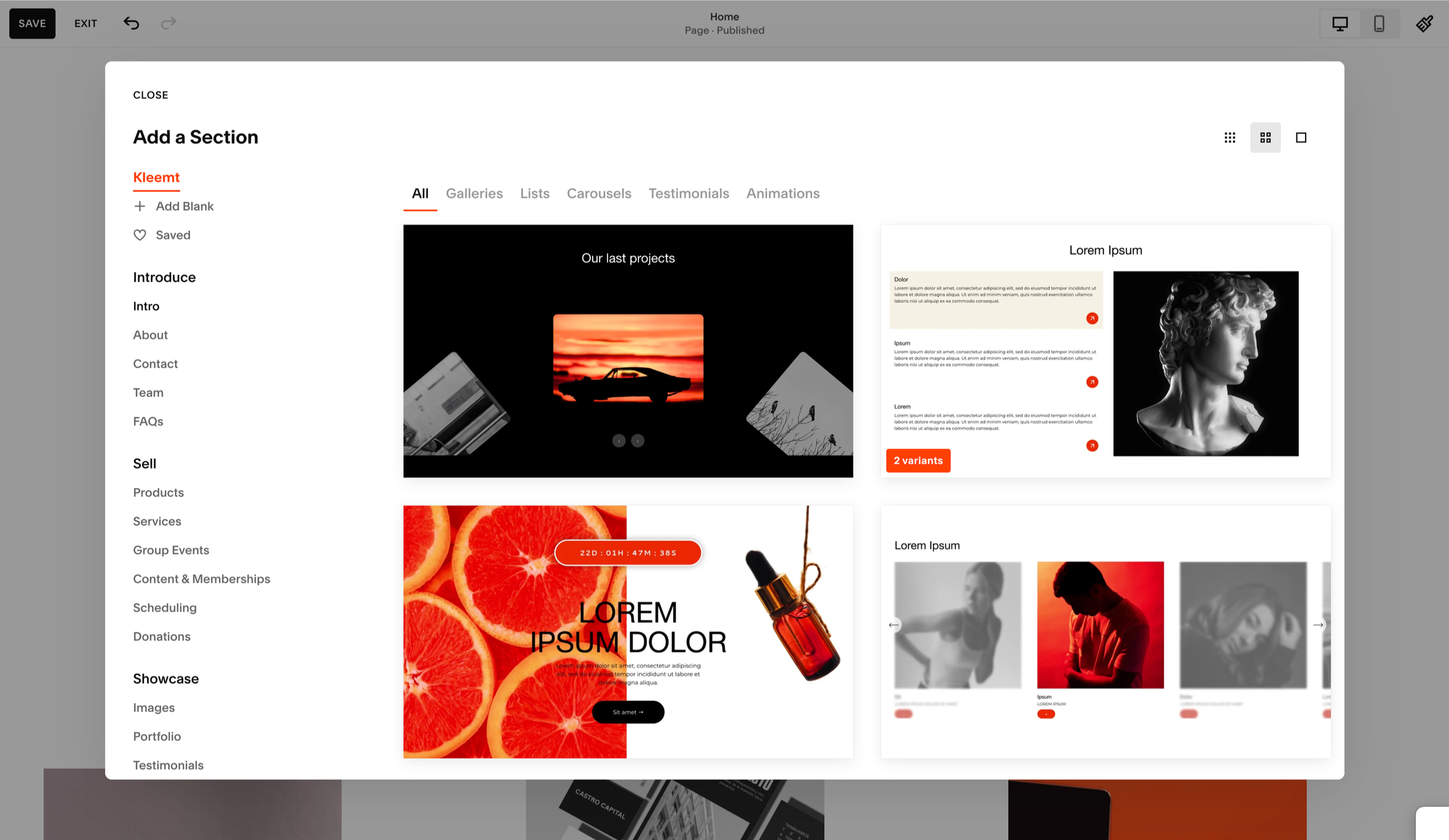 With Kleemt, add unique sections directly from the Squarespace editor and take your site to the next level.